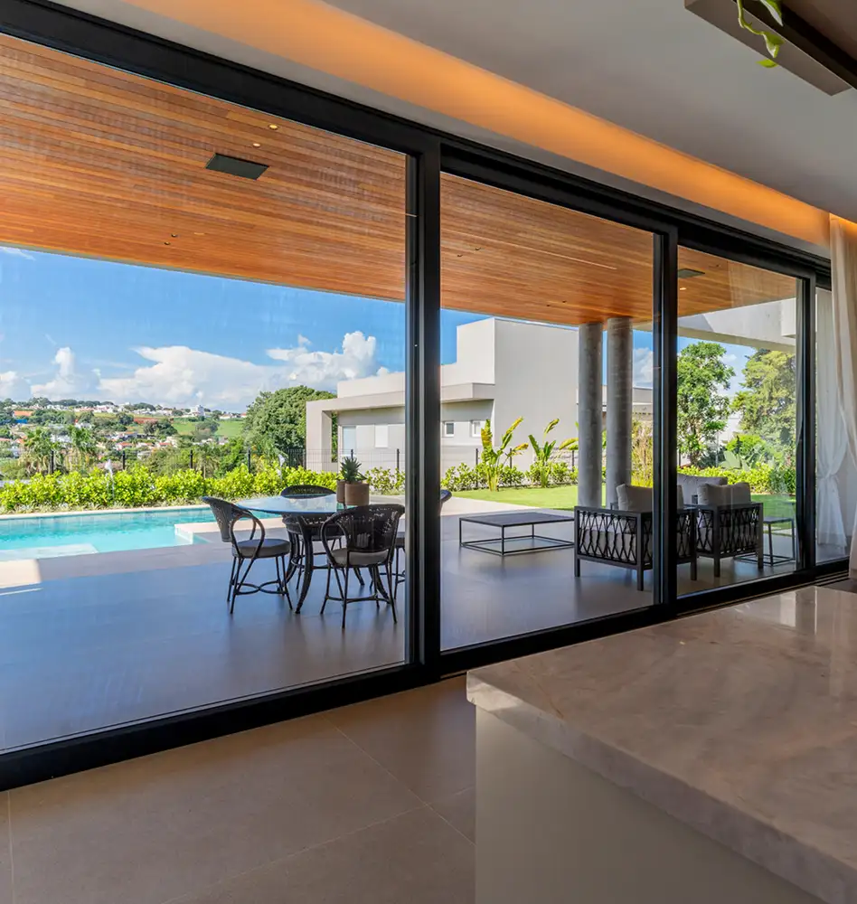 Utilizamos ferragens de padrão europeu, com sistema multiponto e componentes projetados para garantir segurança máxima e fechamento preciso em cada vão. O conjunto entrega mais firmeza, melhor vedação e sensação de robustez no uso diário. Nas esquadrias de correr, aplicamos roldanas em inox com auto nivelamento, dimensionadas para suportar grandes vãos com estabilidade e suavidade de movimento, mantendo a performance e o acabamento ao longo dos anos.